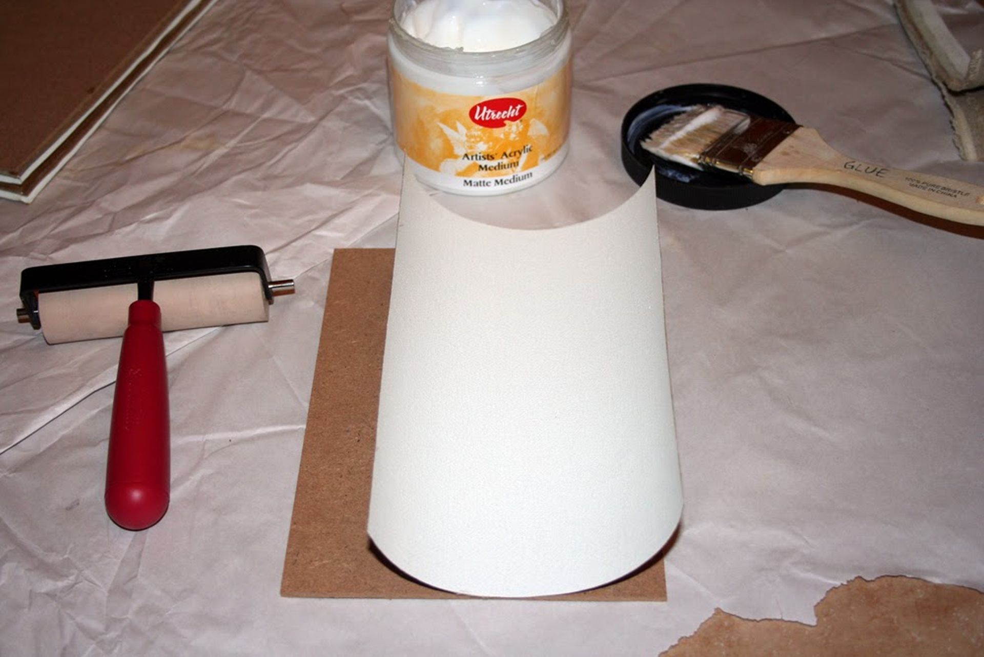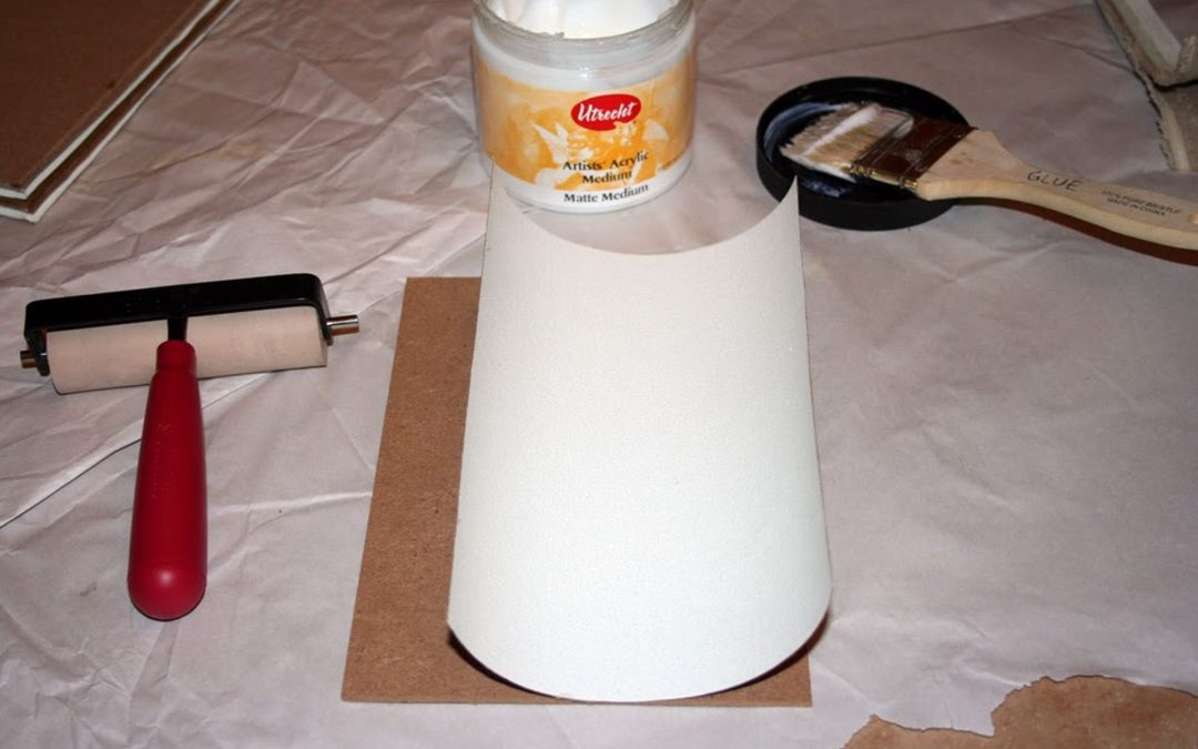A szükséges eszközök: A farost és a méretezett vászon, egy gumihenger, amit a tapétázáshoz is használnak, egy ecset és a ragasztó. Ragasztónak lehet használni akril kötőmédiumot is, vagy enyv oldatot, de a PVA ragasztó jobb.