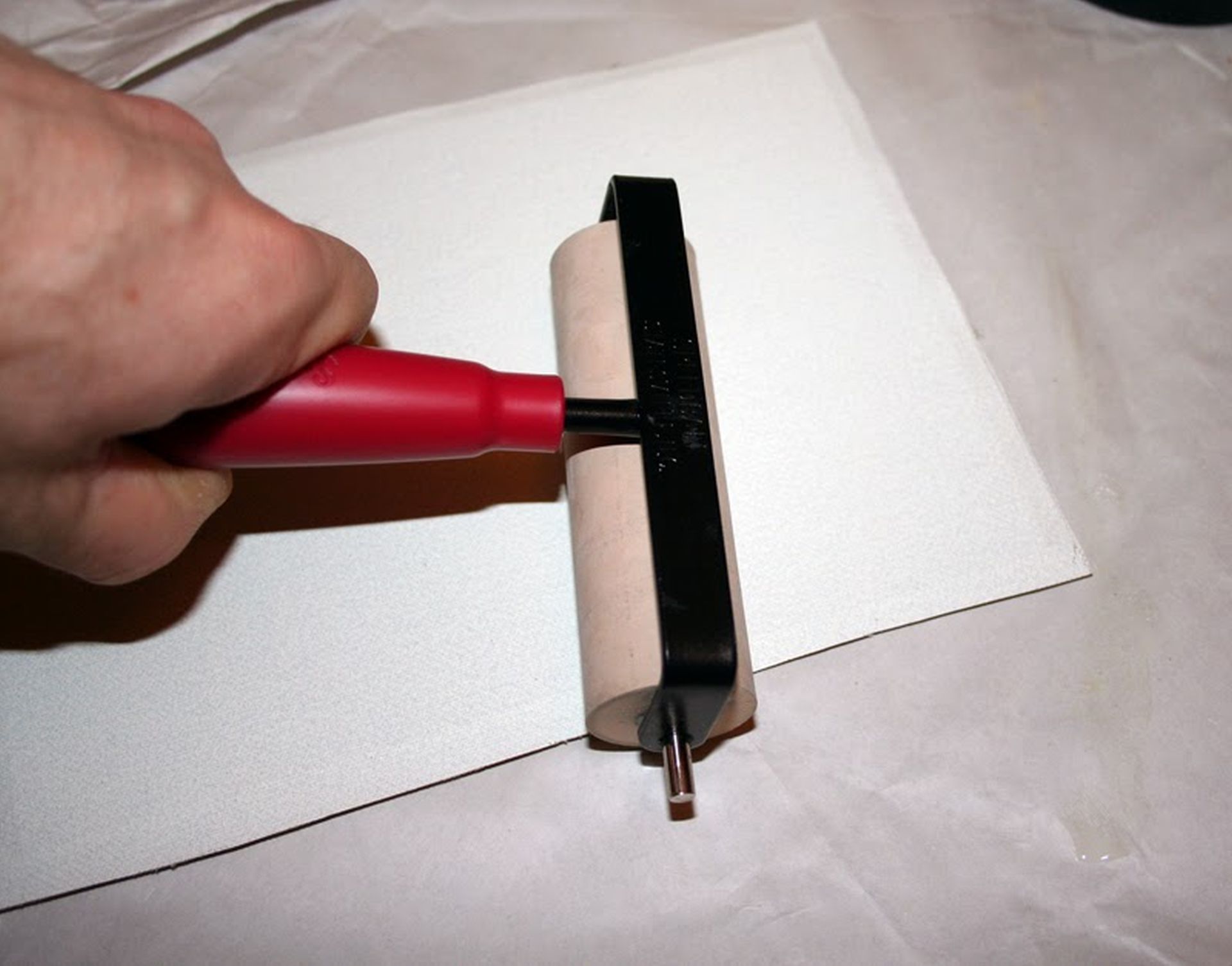 A vásznat egy határozott mozdulattal ráillesztjük a beragasztózott farostra, majd a gumihengerrel jó alaposan rápréseljük, ezzel a buborékokat is kinyomjuk a vászon alól és az egyenetlen ragasztót is egyenletessé préseli a vászon alatt.