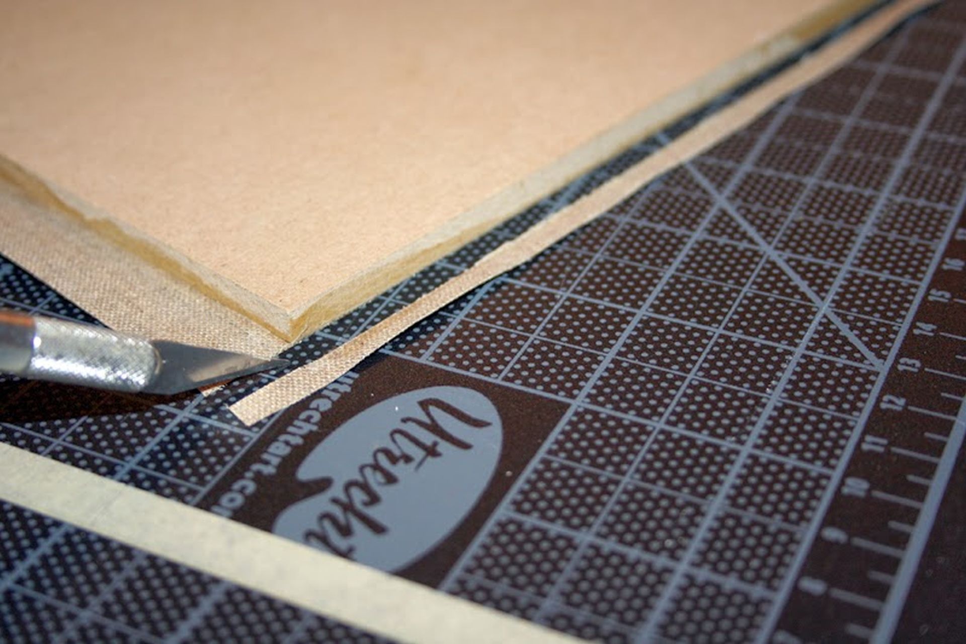 Egy éles szikével, vagy sniccerrel óvatosan levágjuk a fölös vásznat a panelről.
