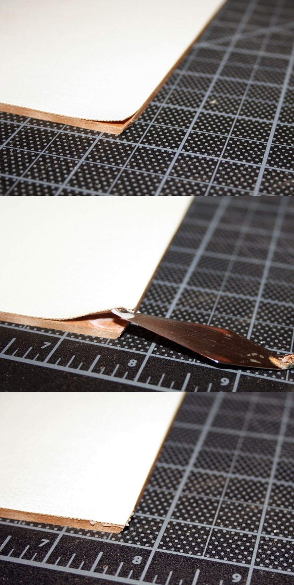 A PVA ragasztót ezúttal hígítás nélkül használjuk, kissé ragacsos, folyékony gumiszerűen nyúlós, így nem könnyű eloszlatni, de ne sajnáljuk, kenjük jó vastagon és egyenletesen. A szélekre és sarkokra különösen figyeljük, hogy ezekre a helyekre is elég jusson. Nagyon gyorsnak kell lennünk, mert a ragasztó 1-2 perc alatt elkezd be sűrűsödni és kötni, tehát nincs sok időnk. Célszerű mindent előkészíteni, hogy ne veszítsünk időt, keresgéléssel.
