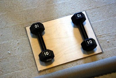 Előre oda kell készíteni egy a farosttal megegyező méretű farostot, amit ráteszünk a vászon tetejére, majd nehéz tárgyakkal lesúlyozzuk, ez a képen látható súlyzókon kívül bármilyen nehéz, alkalmi súlynak megfelelő tárgy lehet.