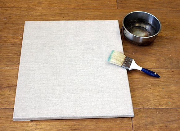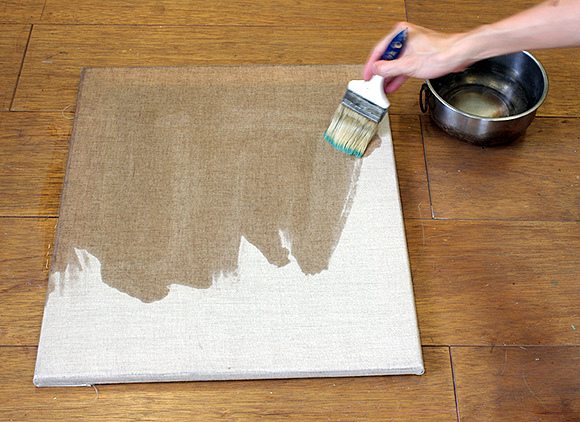 Első lépés a vászon impregnálása, az enyvoldattal való lekenés. Ezt egyenletes rétegben, jól szétoszlatva végezzük. A hagyományos enyvoldat helyett, használhatunk PVA ragasztót is, ezt egy kicsit lehet hígítani, hogy kezelhetőbb legyen, ha túl sűrű, kb. 1:1 arányban vízzel.