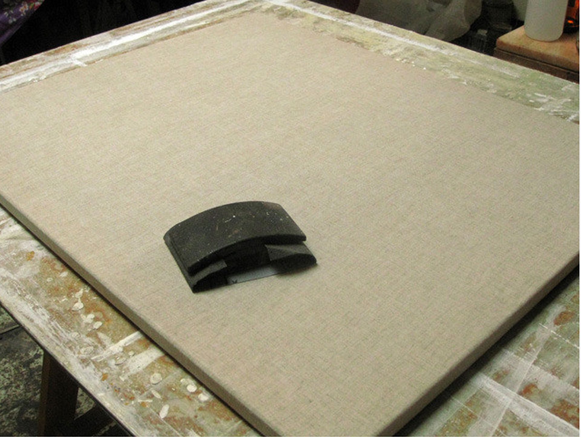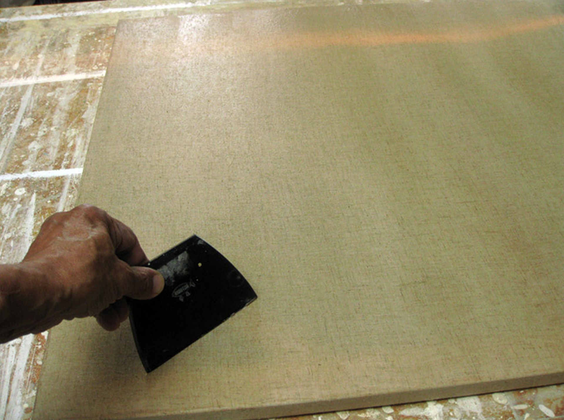 “Lehúzzuk” a felesleges enyvet a vászonról, a kés éle kb. 45 fokos szögben van a vászonra fektetve, és közben erősen bele is “passzírozzuk” az enyvet a vászon szövet apró kis lyukacskáiba.