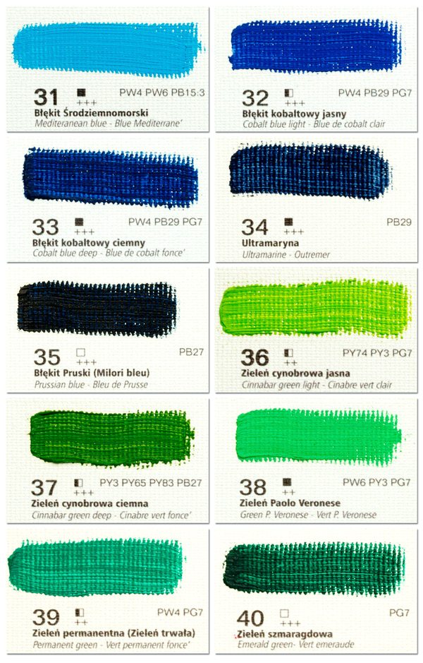 A zöld színeket kevésbé szoktam javasolni, mert véleményem szerint igazán jó és használható zöldeket magunknak kell kikevernünk. Pl. Cinóber zöld stb. Ugyanakkor van néhány hasznos zöld, melyet érdemes beszerezni.