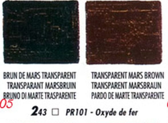 Egy természetes vas és mangán oxid tartalmú barnaszén. Félig fedő szép lazúros meleg barna színe van. A gyártók gyakran két különböző árnyalatot neveznek el a fenti két néven, pedig valójában mindkét név ugyanazt a pigmentet takarja. Néha ezt is helyettesítik szintetikus vas oxiddal.