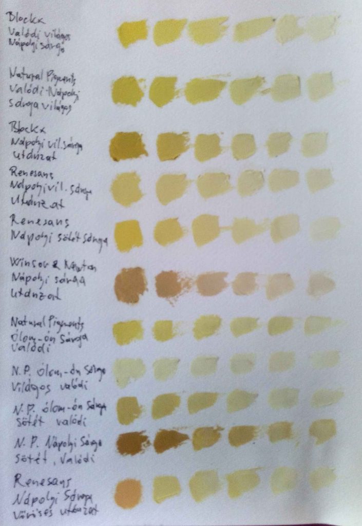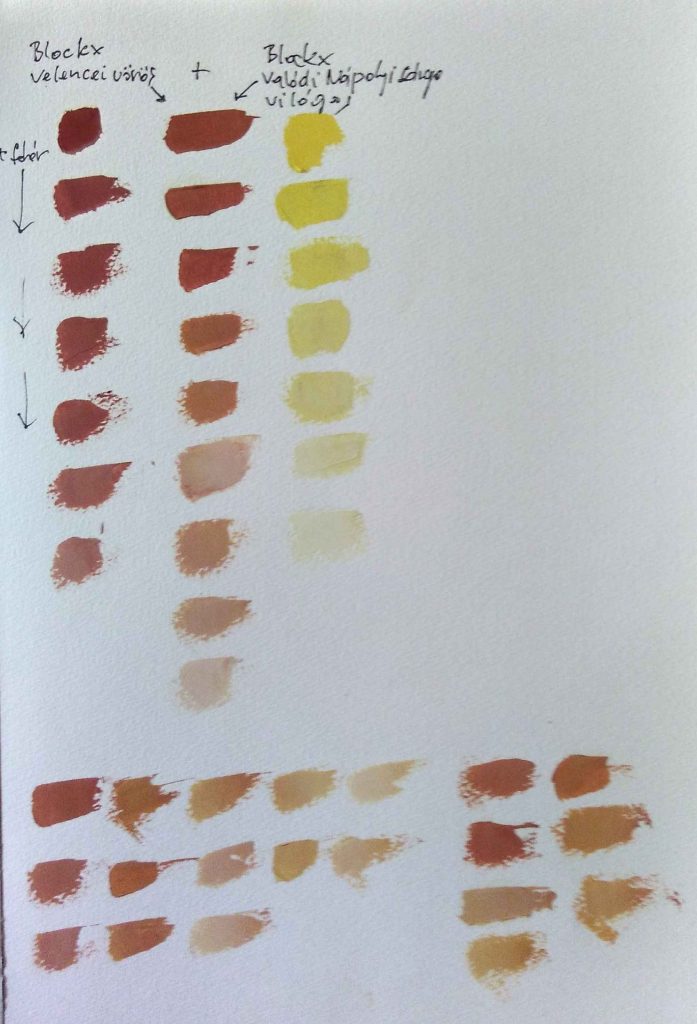 Hasonlítsd össze a sárgák és vörösek színezőerejét, ill. egymással és/vagy fehérrel kevert színárnyalatait. Pl. melyik szín lesz rózsaszínes, melyik pedig narancsos stb. Így nagyon jól megismered azokat a különbségeket melyekről a cikkben szó esett.