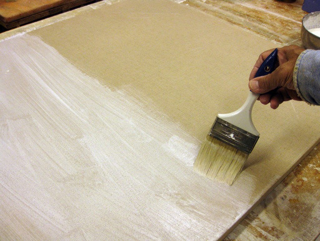 2-3 rétegben egy ecsettel egyenletesen oszlatva hordjuk fel az alapozót a vászonra, farostra.