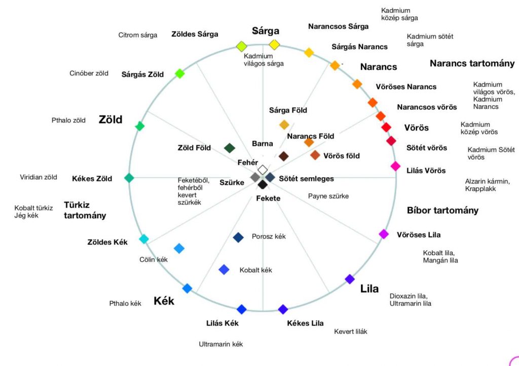 Ez óriási segítséget jelent a festékválasztásnál, és a színkeverés tudatossá tételében. Továbbá abban is segítségünkre lesz, hogy mindíg tudjuk, hogy egy tubus festékben milyen színek található, hogy ténylegesen milyen színeket keverünk egymással.