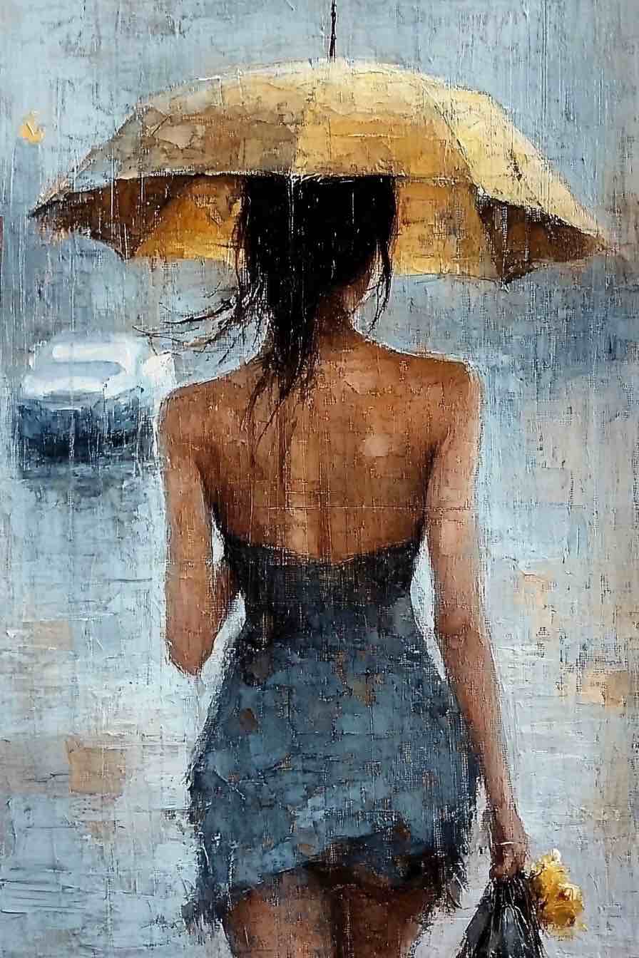 Technika: Az akril aláfestés és impasztó paszta kombinációja különleges esőhatást kelt, míg az olajfestés finom részletei életre keltik az alakot.