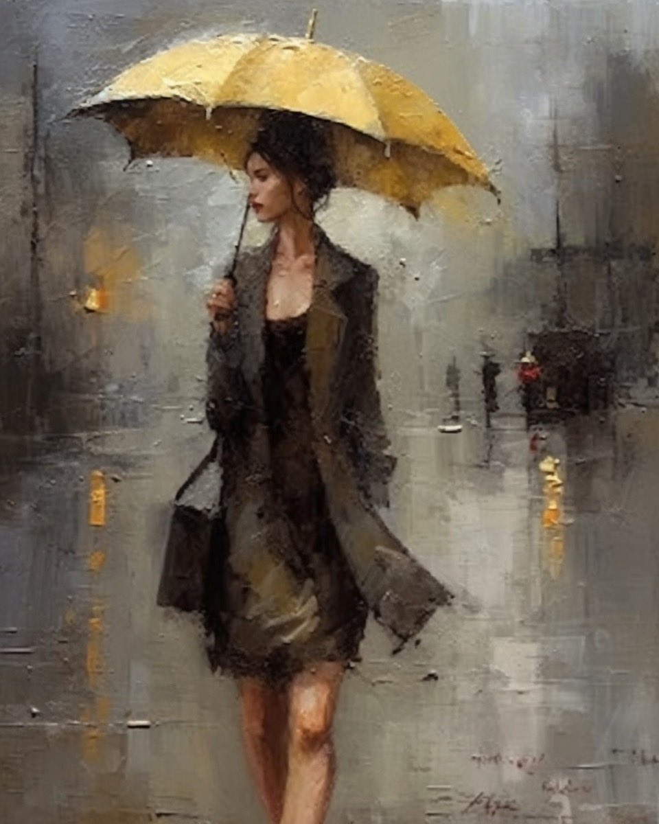 Leírás: Egy nő sárga esernyővel és elegáns ruházatban sétál egy esős városi utcán, miközben a város fényei visszatükröződnek a nedves felületeken.