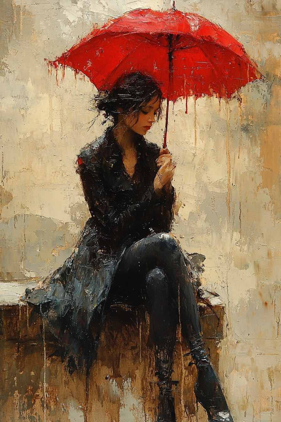 Leírás: Egy elegáns nő piros esernyő alatt ül, melankolikus hangulatot árasztva.