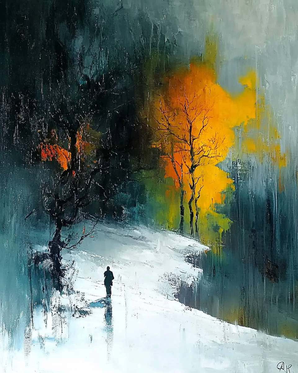 Egy modern, absztrakt expresszíonista alkotást, amelyben a színek kontrasztjai és a lendületes ecsetkezelés találkoznak izgalmas textúrákkal. A képnek nagyon erős dinamikája és drámai hatzást keltő színkontrasztjai vannak.